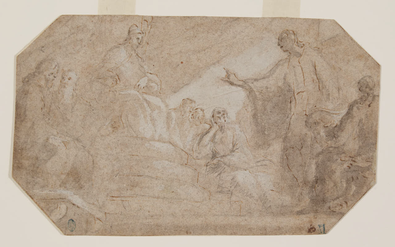 penna, inchiostro bruno, acquerello grigio, rialzato a biacca, tracce di matita nera su carta ingiallita