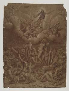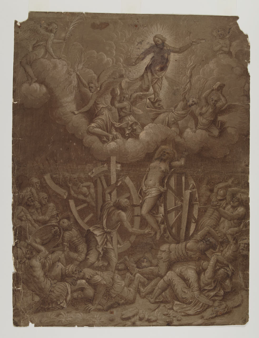 - NOTIZIE STORICO CRITICHE Il foglio raffigurante il "Martirio di santa Caterina" che un'antica nota manoscritta al verso attribuisce a Paolo Farinati, e che nell'inventario storico è trattato come lavoro di Lelio Orsi, è probabilmente un'esecuzione riconducibile alla cerchia di Giulio Romano, tratto da un'invenzione del maestro: l'originale di Giulio (fino a qui non reperito) era servito come modello per la stampa di Diana Scultori con questo soggetto (1561-1562).\nQuesta elaborazione del tema ebbe ampia fortuna, come attestano un dipinto alla Burghley House di Stamford, un disegno al Louvre (MLAG, inv. 3622, "Copie d'après Pippi Giulio"), un altro - che copia solo la parte inferiore - del St. Catherine's College di Cambridge (inv. 62), un dipinto dell'Istituto Trentino-Alto Adige per Assicurazioni e un foglio del Teylers Museum di Haarlem (inv. K II 109).