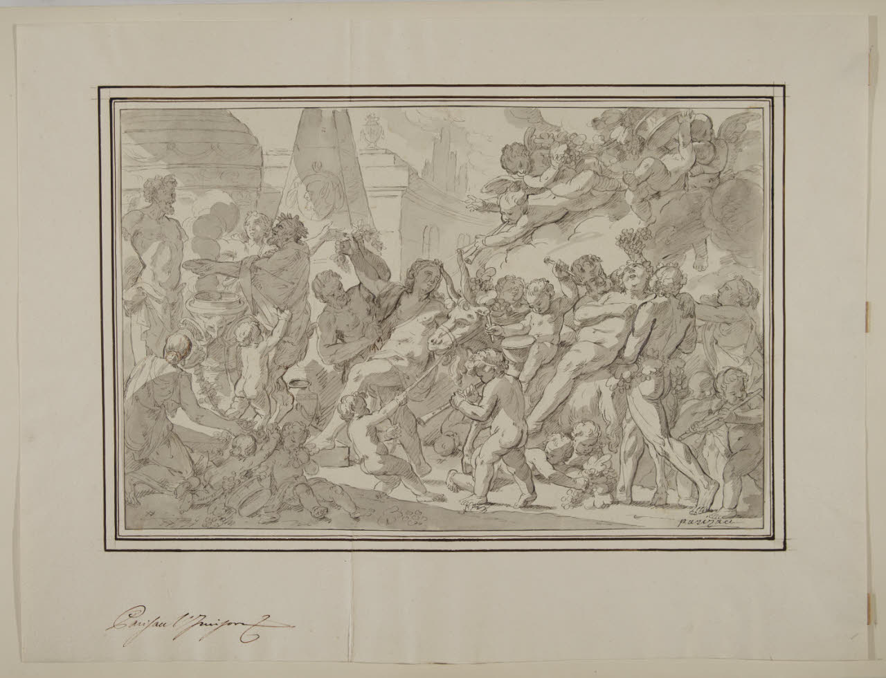 - NOTIZIE STORICO CRITICHE Appartenuto alla collezione del Principe Alberico XII Barbiano di Belgioioso, il disegno venne attribuito da Giuseppe Bossi a Philippe-Louis Parizeau, come si legge nella nota manoscritta di suo pugno sul montaggio. Pittore, disegnatore, incisore e stampatore, la produzione di Parizeau si caratterizzò per le numerose scene di sacrifici antichi e cortei di divinità, tematiche all'interno delle quali rientra anche questo foglio con una scena bacchica. Una fanciulla, forse la principessa Arianna, è in testa ad un corteo di satiri e baccanti che accompagnano il pingue ed ebbro Bacco sul dorso di un mulo. Dei vivaci puttini in cielo suonano trombe e rovesciano cesti di pampini verso il basso. Sullo sfondo di alcune architetture classicheggianti, il corteo si dirige verso una statua di Priamo, davanti alla quale un satiro sta offrendo un sacrificio.