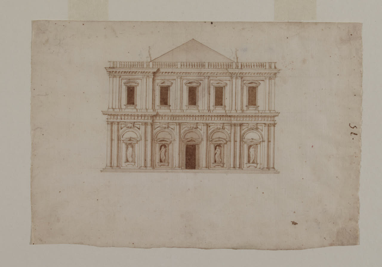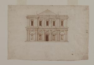 - NOTIZIE STORICO CRITICHE L'Album Tibaldi entra nelle raccolte del Civico Museo d'Arte Antica, al Castello Sforzesco, nel 1905 quando è acquistato grazie al mercante d'arte Julius Böhler di Monaco. Nel 1904 l'avvocato Giuseppe Toesca propone senza successo l'acquisto dell'album al Consiglio Direttivo del Museo. Un anno più tardi, con una grande riduzione di prezzo (da 1800 a 800 lire), la raccolta di 42 disegni entra nelle collezioni civiche su proposta di Gustavo Frizzoni e con il benestare di Luca Beltrami. L'album Tibaldi aveva fatto parte della collezione di Carlo Morbio (1811-1881), nato a Novara ma stabilitosi fin da giovane a Milano. Nel "Catalogo ragionato ed illustrazione degli autografi e dei ritratti di celebri personaggi dal Risorgimento delle lettere insino a noi, raccolti e posseduti dal cav. Carlo Morbio" (Milano, 1857, p. 97) e ancora nelle "Opere Storico-Numismatiche di Carlo Morbio" (Bologna, 1870, p. 186) è lo stesso Morbio a citare la "Cartella di Pellegrino" definita una "preziosa raccolta de' suoi disegni originali" notando come "varj sono firmati col suo monogramma" (1857). È probabile sia stato soprattutto il fraintendimento del monogramma PPAM (inscritto in un cuore sormontato da una croce), all'epoca interpretato come firma di Pellegrino Pellegrini, ad aver portato il conoscitore e chi dopo di lui ebbe modo di vedere e valutare i disegni all'errata attribuzione al Tibaldi; ancora nel 1939, Giovanni Rocco parla in questi termini del marchio dell'album nella sua pubblicazione dedicata all'impegno dell'artista della Valsolda presso il Duomo di Milano. Dopo la morte del Morbio, la figlia Giulia, moglie dell'imprenditore tessile Benigno Crespi, cede gran parte della collezione paterna al libraio Theodor Ackermann che la vende in varie aste a Lipsia. Un altro mercante tedesco, il già citato Böhler, fa da mediatore per il ritorno dei disegni a Milano. \nIl foglio, ancora anonimo, presenta la facciata di un palazzo a due piani. Al piano inferiore, quattro nicchie, due per lato, ospitano statue appena accennate nel disegno. Interessante notare che le lettere SL scritte con tratto spesso e inchiostro scuro lungo il margine destro del foglio, collegano questo disegno al foglio 13 dello stesso album Tibaldi che, se girato in senso orizzontale, reca nella stessa posizione di questo foglio le stesse lettere in ordine invertito (LS). Da aggiungere che i due disegni condividono identica filigrana (Briquet 9722).