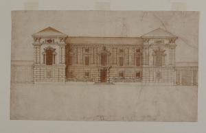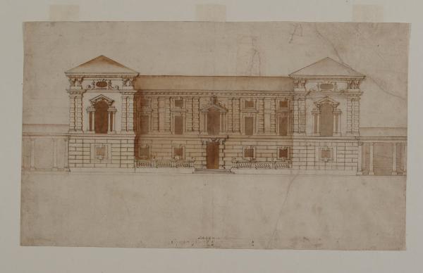 - NOTIZIE STORICO CRITICHE L'Album Tibaldi entra nelle raccolte del Civico Museo d'Arte Antica, al Castello Sforzesco, nel 1905 quando è acquistato grazie al mercante d'arte Julius Böhler di Monaco. Nel 1904 l'avvocato Giuseppe Toesca propone senza successo l'acquisto dell'album al Consiglio Direttivo del Museo. Un anno più tardi, con una grande riduzione di prezzo (da 1800 a 800 lire), la raccolta di 42 disegni entra nelle collezioni civiche su proposta di Gustavo Frizzoni e con il benestare di Luca Beltrami. L'album Tibaldi aveva fatto parte della collezione di Carlo Morbio (1811-1881), nato a Novara ma stabilitosi fin da giovane a Milano. Nel "Catalogo ragionato ed illustrazione degli autografi e dei ritratti di celebri personaggi dal Risorgimento delle lettere insino a noi, raccolti e posseduti dal cav. Carlo Morbio" (Milano, 1857, p. 97) e ancora nelle "Opere Storico-Numismatiche di Carlo Morbio" (Bologna, 1870, p. 186) è lo stesso Morbio a citare la "Cartella di Pellegrino" definita una "preziosa raccolta de' suoi disegni originali" notando come "varj sono firmati col suo monogramma" (1857). È probabile sia stato soprattutto il fraintendimento del monogramma PPAM (inscritto in un cuore sormontato da una croce), all'epoca interpretato come firma di Pellegrino Pellegrini, ad aver portato il conoscitore e chi dopo di lui ebbe modo di vedere e valutare i disegni all'errata attribuzione al Tibaldi; ancora nel 1939, Giovanni Rocco parla in questi termini del marchio dell'album nella sua pubblicazione dedicata all'impegno dell'artista della Valsolda presso il Duomo di Milano. Dopo la morte del Morbio, la figlia Giulia, moglie dell'imprenditore tessile Benigno Crespi, cede gran parte della collezione paterna al libraio Theodor Ackermann che la vende in varie aste a Lipsia. Un altro mercante tedesco, il già citato Böhler, fa da mediatore per il ritorno dei disegni a Milano. \nIl foglio, ancora anonimo, presenta la facciata di un grande palazzo inserito tra un loggiato, a sinistra, e una grande scalinata a destra. Lo scudo araldico accennato sopra il portale di ingresso conferma l'ipotesi che si tratti di una residenza nobiliare ma è troppo poco leggibile per indirizzarci nell'individuazione della corretta famiglia di committenti.