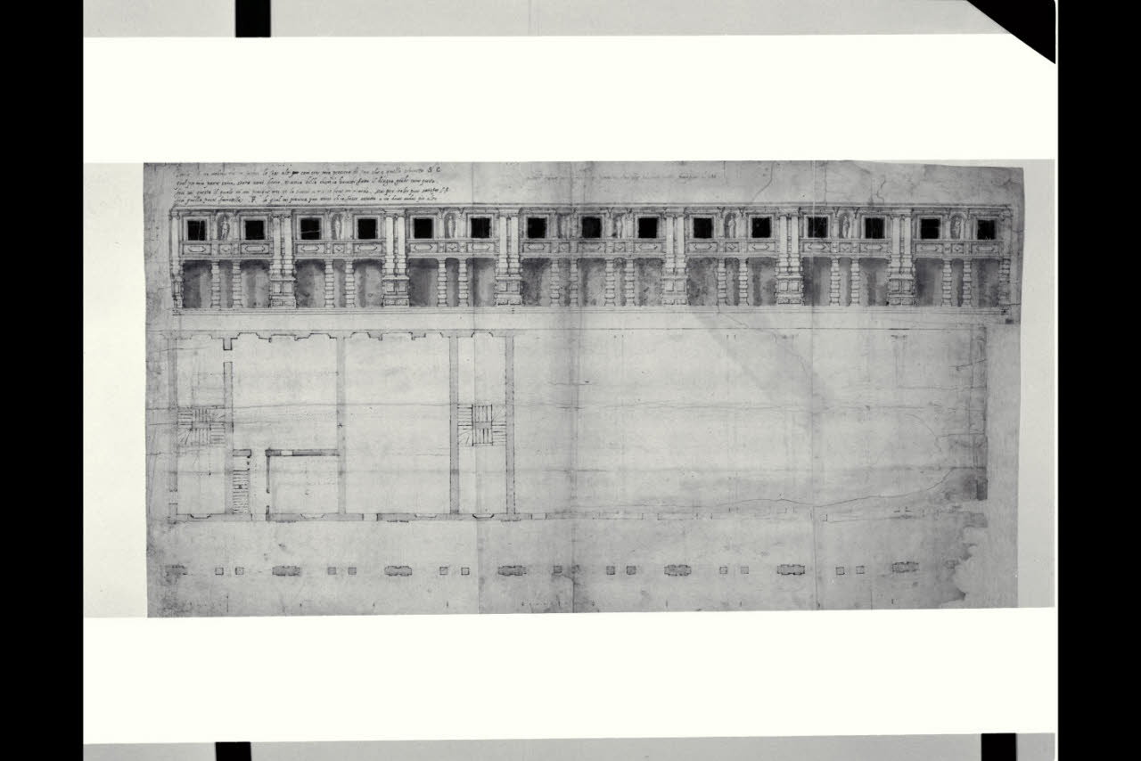- NOTIZIE STORICO CRITICHE L'Album Tibaldi entra nelle raccolte del Civico Museo d'Arte Antica, al Castello Sforzesco, nel 1905 quando è acquistato grazie al mercante d'arte Julius Böhler di Monaco. Nel 1904 l'avvocato Giuseppe Toesca propone senza successo l'acquisto dell'album al Consiglio Direttivo del Museo. Un anno più tardi, con una grande riduzione di prezzo (da 1800 a 800 lire), la raccolta di 42 disegni entra nelle collezioni civiche su proposta di Gustavo Frizzoni e con il benestare di Luca Beltrami. L'album Tibaldi aveva fatto parte della collezione di Carlo Morbio (1811-1881), nato a Novara ma stabilitosi fin da giovane a Milano. Nel "Catalogo ragionato ed illustrazione degli autografi e dei ritratti di celebri personaggi dal Risorgimento delle lettere insino a noi, raccolti e posseduti dal cav. Carlo Morbio" (Milano, 1857, p. 97) e ancora nelle "Opere Storico-Numismatiche di Carlo Morbio" (Bologna, 1870, p. 186) è lo stesso Morbio a citare la "Cartella di Pellegrino" definita una "preziosa raccolta de' suoi disegni originali" notando come "varj sono firmati col suo monogramma" (1857). È probabile sia stato soprattutto il fraintendimento del monogramma PPAM (inscritto in un cuore sormontato da una croce), all'epoca interpretato come firma di Pellegrino Pellegrini, ad aver portato il conoscitore e chi dopo di lui ebbe modo di vedere e valutare i disegni all'errata attribuzione al Tibaldi; ancora nel 1939, Giovanni Rocco parla in questi termini del marchio dell'album nella sua pubblicazione dedicata all'impegno dell'artista della Valsolda presso il Duomo di Milano. Dopo la morte del Morbio, la figlia Giulia, moglie dell'imprenditore tessile Benigno Crespi, cede gran parte della collezione paterna al libraio Theodor Ackermann che la vende in varie aste a Lipsia. Un altro mercante tedesco, il già citato Böhler, fa da mediatore per il ritorno dei disegni a Milano. \nTornando al monogramma, assente in questo caso, il suo significato è intuito da Thurber (1994): Pompeo Pedemonte Architetto Mantovano. Ancora Thurber riconosce nel disegno un progetto per la canonica di Santa Barbara in Palazzo Ducale, a Mantova (così come Carpeggiani 1994). L'impegno di Pedemonte per l'edificio è testimoniato anche dai fogli 14, 15 e 16 di questo album che si concentrano su un cortile porticato, previsto in questa prima fase di progettazione. Guglielmo Gonzaga decide, nel 1572, di far costruire una residenza per i canonici della chiesa palatina di Santa Barbara. Nel 1575 Pedemonte sta lavorando al progetto ma a lavori appena cominciati, prima del 1579, l'area inizialmente scelta per la canonica viene invece destinata al Giardino Pensile. Nel 1582-1583 è finalmente individuato un nuovo sito e nel 1586 il cantiere è avviato (la prima pietra è posata nel febbraio 1587) sotto la guida di Pompeo Pedemonte e di Bernardino Facciotto. Questo foglio, studio per il cortile della canonica, reca una scritta che documenta una modifica dell'iniziale idea di Pedemonte di costruire "le Case alte" per adattarsi alla volontà del Gonzaga (un foglio dall'ubicazione ignota mostra la prima idea dell'architetto: un porticato a due ordini risultante in edifici di maggiore altezza). Il portico disegnato su questo foglio è ritmato da coppie di pilastri fasciati che si alternano a lesene binate su alti piedistalli su cui poggia la cornice sommitale. Il 14 agosto 1587 muore Guglielmo Gonzaga e il suo successore, Vincenzo, fa semplificare il progetto da un ignoto autore. I lavori sono così velocemente conclusi l'anno successivo: il progetto di Pedemonte è stato realizzato solo in minima parte (Carpeggiani 2002). \nSi noti che questo foglio ha una filigrana (un giglio sovrastante una M) molto simile ai fogli 1, 11 e 25 dello stesso Album, tutti di Pompeo Pedemonte.