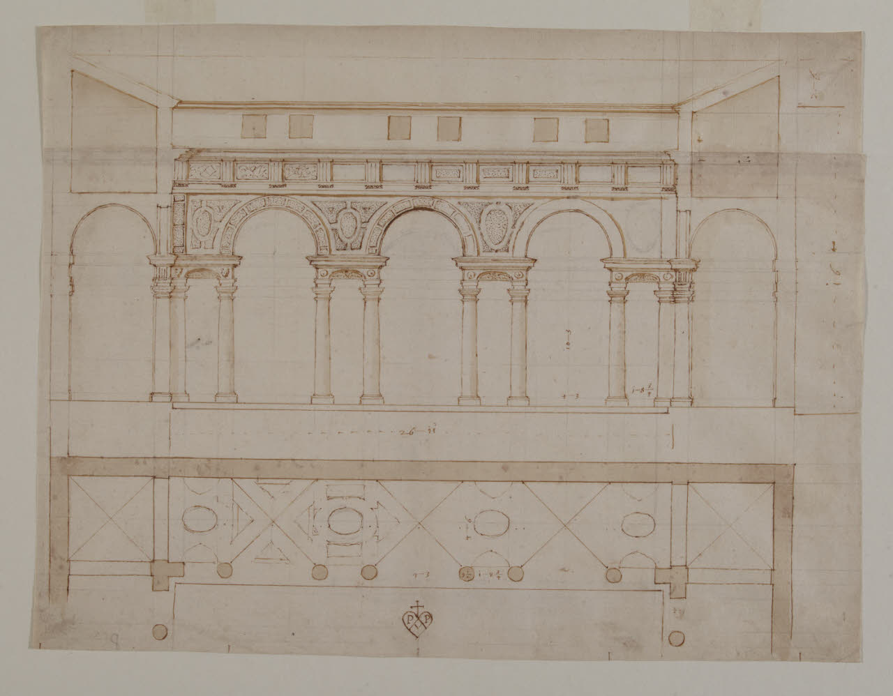 - NOTIZIE STORICO CRITICHE L'Album Tibaldi entra nelle raccolte del Civico Museo d'Arte Antica, al Castello Sforzesco, nel 1905 quando è acquistato grazie al mercante d'arte Julius Böhler di Monaco. Nel 1904, l'avvocato Giuseppe Toesca propone senza successo l'acquisto dell'album al Consiglio Direttivo del Museo. Un anno più tardi, con una grande riduzione di prezzo (da 1800 a 800 lire), la raccolta di 42 disegni entra nelle collezioni civiche su proposta di Gustavo Frizzoni e con il benestare di Luca Beltrami. L'album Tibaldi aveva fatto parte della collezione di Carlo Morbio (1811-1881), nato a Novara ma stabilitosi fin da giovane a Milano. Nel "Catalogo ragionato ed illustrazione degli autografi e dei ritratti di celebri personaggi dal Risorgimento delle lettere insino a noi, raccolti e posseduti dal cav. Carlo Morbio" (Milano, 1857, p. 97) e ancora nelle "Opere Storico-Numismatiche di Carlo Morbio" (Bologna, 1870, p. 186) è lo stesso Morbio a citare la "Cartella di Pellegrino" definita una "preziosa raccolta de' suoi disegni originali" notando come "varj sono firmati col suo monogramma" (1857). È probabile sia stato soprattutto il fraintendimento del monogramma PPAM (inscritto in un cuore sormontato da una croce), all'epoca interpretato come firma di Pellegrino Pellegrini, ad aver portato il conoscitore e chi dopo di lui ebbe modo di vedere e valutare i disegni all'errata attribuzione al Tibaldi; ancora nel 1939, Giovanni Rocco parla in questi termini del marchio dell'album nella sua pubblicazione dedicata all'impegno dell'artista della Valsolda presso il Duomo di Milano. Dopo la morte del Morbio, la figlia Giulia, moglie dell'imprenditore tessile Benigno Crespi, cede gran parte della collezione paterna al libraio Theodor Ackermann che la vende in varie aste a Lipsia. Un altro mercante tedesco, il già citato Böhler, fa da mediatore per il ritorno dei disegni a Milano.\nTornando al monogramma, su questo foglio in basso al centro, il suo significato è intuito da Thurber (1994): Pompeo Pedemonte Architetto Mantovano. Carpeggiani (1994) riconosce nel disegno un progetto per la canonica di Santa Barbara in Palazzo Ducale, a Mantova. Guglielmo Gonzaga decide, nel 1572, di far costruire una residenza per i canonici della chiesa palatina di Santa Barbara. Nel 1575 Pedemonte sta lavorando al progetto ma a lavori appena cominciati, prima del 1579, l'area inizialmente scelta per la canonica viene invece destinata al Giardino Pensile. Nel 1582-1583 è finalmente individuato un nuovo sito e nel 1586 il cantiere è avviato (la prima pietra è posata nel febbraio 1587) sotto la guida di Pompeo Pedemonte e di Bernardino Facciotto. Il 14 agosto 1587 muore Guglielmo Gonzaga e il suo successore, Vincenzo, fa semplificare il progetto da un ignoto autore. I lavori sono così velocemente conclusi l'anno successivo: il progetto di Pedemonte è stato realizzato solo in minima parte. L'impegno di Pedemonte per l'edificio è testimoniato anche dai fogli 7, 14 e 16 di questo album. I fogli dal 14 al 16, in particolare, sono tra i pochi documenti disponibili per la ricostruzione della fase iniziale della progettazione della Canonica, che nella sua prima versione prevedeva almeno un cortile porticato. Questo progetto mostra un portico a serliana continua e per la forte somiglianza tra i capitelli che qui compaiono e quelli del Giardino Pensile, si può ipotizzare questo foglio faccia parte del progetto selezionato nella prima fase dei lavori per la canonica (Carpeggiani 2002). Si noti che la filigrana (corona cerchiata) di questi foglio è la numero 4871 del Briquet mancante della contromarca che però compare, da sola, al foglio 16.