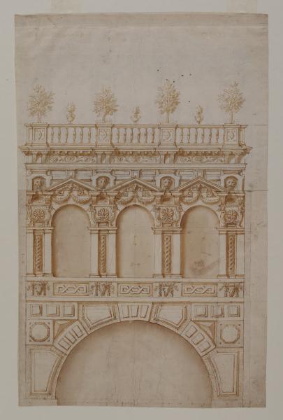 - NOTIZIE STORICO CRITICHE L'Album Tibaldi entra nelle raccolte del Civico Museo d'Arte Antica, al Castello Sforzesco, nel 1905 quando è acquistato grazie al mercante d'arte Julius Böhler di Monaco. Nel 1904 l'avvocato Giuseppe Toesca propone senza successo l'acquisto dell'album al Consiglio Direttivo del Museo. Un anno più tardi, con una grande riduzione di prezzo (da 1800 a 800 lire), la raccolta di 42 disegni entra nelle collezioni civiche su proposta di Gustavo Frizzoni e con il benestare di Luca Beltrami. L'album Tibaldi aveva fatto parte della collezione di Carlo Morbio (1811-1881), nato a Novara ma stabilitosi fin da giovane a Milano. Nel "Catalogo ragionato ed illustrazione degli autografi e dei ritratti di celebri personaggi dal Risorgimento delle lettere insino a noi, raccolti e posseduti dal cav. Carlo Morbio" (Milano, 1857, p. 97) e ancora nelle "Opere Storico-Numismatiche di Carlo Morbio" (Bologna, 1870, p. 186) è lo stesso Morbio a citare la "Cartella di Pellegrino" definita una "preziosa raccolta de' suoi disegni originali" notando come "varj sono firmati col suo monogramma" (1857). È probabile sia stato soprattutto il fraintendimento del monogramma PPAM (inscritto in un cuore sormontato da una croce), all'epoca interpretato come firma di Pellegrino Pellegrini, ad aver portato il conoscitore e chi dopo di lui ebbe modo di vedere e valutare i disegni all'errata attribuzione al Tibaldi; ancora nel 1939, Giovanni Rocco parla in questi termini del marchio dell'album nella sua pubblicazione dedicata all'impegno dell'artista della Valsolda presso il Duomo di Milano. Dopo la morte del Morbio, la figlia Giulia, moglie dell'imprenditore tessile Benigno Crespi, cede gran parte della collezione paterna al libraio Theodor Ackermann che la vende in varie aste a Lipsia. Un altro mercante tedesco, il già citato Böhler, fa da mediatore per il ritorno dei disegni a Milano. \nTornando al monogramma, qui assente, il suo significato è intuito da Thurber (1994): Pompeo Pedemonte Architetto Mantovano. Thurber per primo collega il disegno all'entrata di Enrico III di Valois a Mantova il 2 agosto 1574. Carpeggiani conferma l'ipotesi (brevemente nel 1994 e in maniera più approfondita nel 2002). Per il passaggio del re, diretto in Francia per l'incoronazione, la città gonzaghesca, come le altre toccate dal corteo, si dota di apparati effimeri in onore del regnante straniero. Un antico resoconto degli allestimenti di Blaise De Vigenère (1576) è citato da entrambi gli studiosi, che mettono in relazione il disegno di Pedemonte con l'arco n. V. I preparativi cominciarono nel 1574 e, tra i tanti progetti, si prevedeva un giardino effimero per la porta della Guardia dalla quale si accede - ancora oggi - a piazza San Pietro. Giovanni Battista Bertani, prefetto delle fabbriche ducali, era malato e Teodoro di Sangiorgio, segretario de facto di Guglielmo Gonzaga, dovette dunque rivolgersi a Pedemonte. Il poco tempo a disposizione e il confronto difficile da sostenere con Ferrara, dove il corteo regio sarebbe passato prima di giungere a Mantova, spinsero il Sangiorgio a limitare al minimo la costruzione di nuove strutture, privilegiando invece la decorazione di quelle già esistenti. Nel caso della porta della Guardia, per dare più risalto all'antica struttura, Pedemonte prevede una decorazione ad affresco (della quale resta qualche traccia) a creare, virtualmente, un arco più alto e trionfale di quello realmente esistente. Il disegno di Pompeo Pedemonte prevede un'alternativa per la parte sommitale della porta: invece della terrazza, una pergola retta da quattro coppie di colonne e popolata da figuranti. Dall'illustrazione citata del De Vigenère, dove dieci puttini musicanti sembrano ballare sulla balaustra sommitale, deduciamo che il progetto definitivo per la cima dell'arco fu modificato rispetto alle proposte attestate dal foglio in esame.