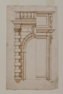 - NOTIZIE STORICO CRITICHE L'Album Tibaldi entra nelle raccolte del Civico Museo d'Arte Antica, al Castello Sforzesco, nel 1905 quando è acquistato grazie al mercante d'arte Julius Böhler di Monaco. Nel 1904 l'avvocato Giuseppe Toesca propone senza successo l'acquisto dell'album al Consiglio Direttivo del Museo. Un anno più tardi, con una grande riduzione di prezzo (da 1800 a 800 lire), la raccolta di 42 disegni entra nelle collezioni civiche su proposta di Gustavo Frizzoni e con il benestare di Luca Beltrami. L'album Tibaldi aveva fatto parte della collezione di Carlo Morbio (1811-1881), nato a Novara ma stabilitosi fin da giovane a Milano. Nel "Catalogo ragionato ed illustrazione degli autografi e dei ritratti di celebri personaggi dal Risorgimento delle lettere insino a noi, raccolti e posseduti dal cav. Carlo Morbio" (Milano, 1857, p. 97) e ancora nelle "Opere Storico-Numismatiche di Carlo Morbio" (Bologna, 1870, p. 186) è lo stesso Morbio a citare la "Cartella di Pellegrino" definita una "preziosa raccolta de' suoi disegni originali" notando come "varj sono firmati col suo monogramma" (1857). È probabile sia stato soprattutto il fraintendimento del monogramma PPAM (inscritto in un cuore sormontato da una croce), all'epoca interpretato come firma di Pellegrino Pellegrini, ad aver portato il conoscitore e chi dopo di lui ebbe modo di vedere e valutare i disegni all'errata attribuzione al Tibaldi; ancora nel 1939, Giovanni Rocco parla in questi termini del marchio dell'album nella sua pubblicazione dedicata all'impegno dell'artista della Valsolda presso il Duomo di Milano. Dopo la morte del Morbio, la figlia Giulia, moglie dell'imprenditore tessile Benigno Crespi, cede gran parte della collezione paterna al libraio Theodor Ackermann che la vende in varie aste a Lipsia. Un altro mercante tedesco, il già citato Böhler, fa da mediatore per il ritorno dei disegni a Milano. \nI fogli 21 e 24 presentano ciascuno due progetti di porte e finestre. Su questo foglio, la metà di sinistra mostra un portale con fasce di bugnato che avvolgono una colonna, decoro sperimentato da Pellegrino Tibaldi ad esempio nel portale del collegio Borromeo di Pavia, completato come nel disegno in questione, da un balcone. La metà di destra è occupata invece da una finestra. La scritta a penna in alto a sinistra, "Ionico rust.", rafforza l'ipotesi si tratti di un foglio di esercizio o di repertorio forse redatto da un giovane architetto o fabbriciere alle prese con le pubblicazioni trattatistiche d'architettura e le novità tipologiche di fine Cinquecento.