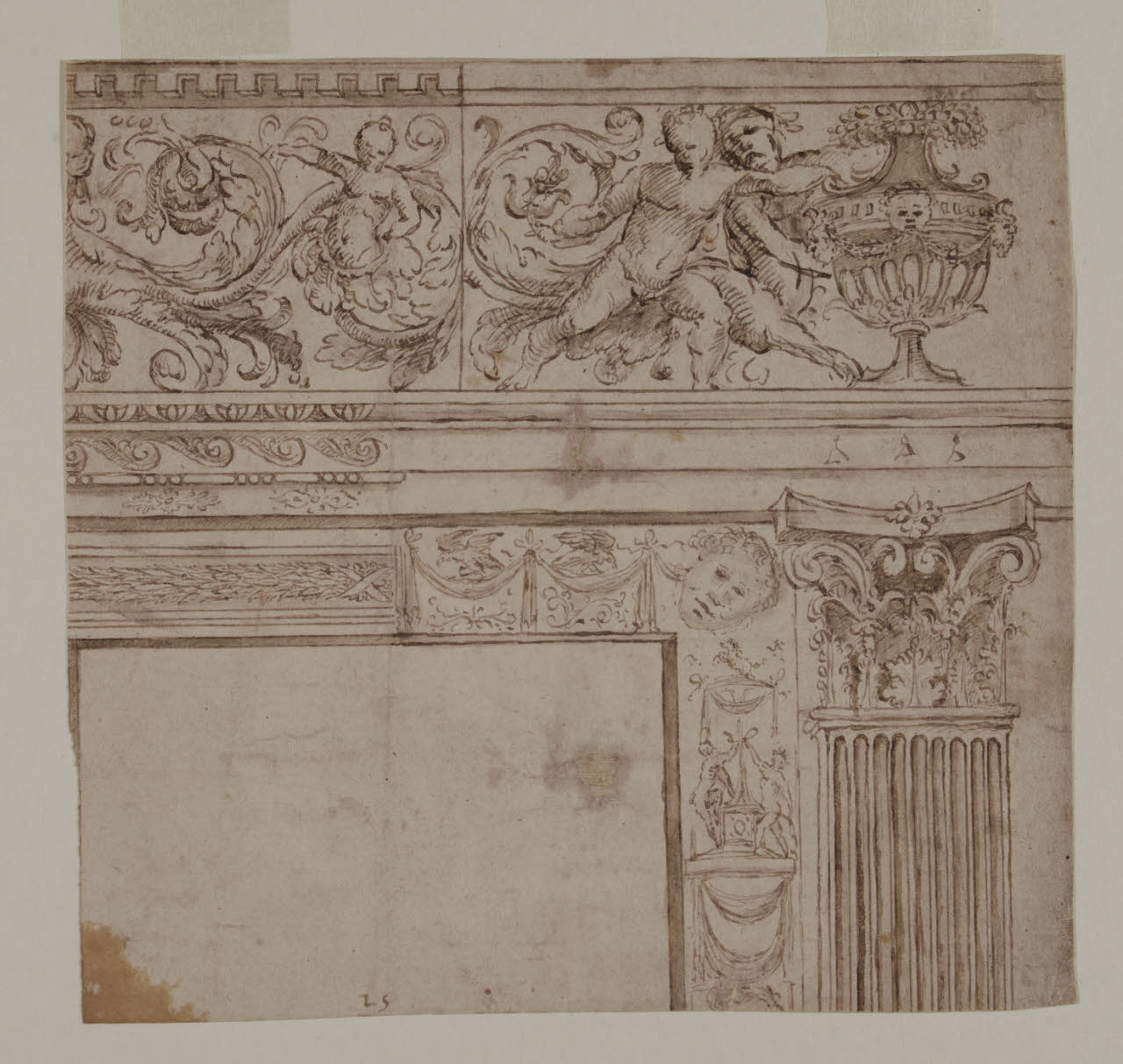 - NOTIZIE STORICO CRITICHE L'Album Tibaldi entra nelle raccolte del Civico Museo d'Arte Antica, al Castello Sforzesco, nel 1905 quando è acquistato grazie al mercante d'arte Julius Böhler di Monaco. Nel 1904 l'avvocato Giuseppe Toesca propone senza successo l'acquisto dell'album al Consiglio Direttivo del Museo. Un anno più tardi, con una grande riduzione di prezzo (da 1800 a 800 lire), la raccolta di 42 disegni entra nelle collezioni civiche su proposta di Gustavo Frizzoni e con il benestare di Luca Beltrami. L'album Tibaldi aveva fatto parte della collezione di Carlo Morbio (1811-1881), nato a Novara ma stabilitosi fin da giovane a Milano. Nel "Catalogo ragionato ed illustrazione degli autografi e dei ritratti di celebri personaggi dal Risorgimento delle lettere insino a noi, raccolti e posseduti dal cav. Carlo Morbio" (Milano, 1857, p. 97) e ancora nelle "Opere Storico-Numismatiche di Carlo Morbio" (Bologna, 1870, p. 186) è lo stesso Morbio a citare la "Cartella di Pellegrino" definita una "preziosa raccolta de' suoi disegni originali" notando come "varj sono firmati col suo monogramma" (1857). È probabile sia stato soprattutto il fraintendimento del monogramma PPAM (inscritto in un cuore sormontato da una croce), all'epoca interpretato come firma di Pellegrino Pellegrini, ad aver portato il conoscitore e chi dopo di lui ebbe modo di vedere e valutare i disegni all'errata attribuzione al Tibaldi; ancora nel 1939, Giovanni Rocco parla in questi termini del marchio dell'album nella sua pubblicazione dedicata all'impegno dell'artista della Valsolda presso il Duomo di Milano. Dopo la morte del Morbio, la figlia Giulia, moglie dell'imprenditore tessile Benigno Crespi, cede gran parte della collezione paterna al libraio Theodor Ackermann che la vende in varie aste a Lipsia. Un altro mercante tedesco, il già citato Böhler, fa da mediatore per il ritorno dei disegni a Milano. \nIl foglio 30, certamente una porzione tagliata da un disegno in origine più grande, presenta un decoro estremamente articolato composto di festoni, grottesche, figurine, uccelli e greche geometriche. La porzione in basso a sinistra, vuota, indica la presenza di un varco, una porta o una finestra.