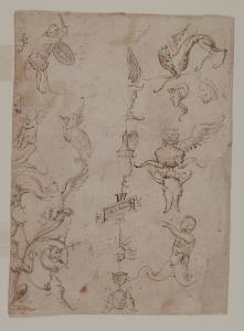 - NOTIZIE STORICO CRITICHE L'Album Tibaldi entra nelle raccolte del Civico Museo d'Arte Antica, al Castello Sforzesco, nel 1905 quando è acquistato grazie al mercante d'arte Julius Böhler di Monaco. Nel 1904 l'avvocato Giuseppe Toesca propone senza successo l'acquisto dell'album al Consiglio Direttivo del Museo. Un anno più tardi, con una grande riduzione di prezzo (da 1800 a 800 lire), la raccolta di 42 disegni entra nelle collezioni civiche su proposta di Gustavo Frizzoni e con il benestare di Luca Beltrami. L'album Tibaldi aveva fatto parte della collezione di Carlo Morbio (1811-1881), nato a Novara ma stabilitosi fin da giovane a Milano. Nel "Catalogo ragionato ed illustrazione degli autografi e dei ritratti di celebri personaggi dal Risorgimento delle lettere insino a noi, raccolti e posseduti dal cav. Carlo Morbio" (Milano, 1857, p. 97) e ancora nelle "Opere Storico-Numismatiche di Carlo Morbio" (Bologna, 1870, p. 186) è lo stesso Morbio a citare la "Cartella di Pellegrino" definita una "preziosa raccolta de' suoi disegni originali" notando come "varj sono firmati col suo monogramma" (1857). È probabile sia stato soprattutto il fraintendimento del monogramma PPAM (inscritto in un cuore sormontato da una croce), all'epoca interpretato come firma di Pellegrino Pellegrini, ad aver portato il conoscitore e chi dopo di lui ebbe modo di vedere e valutare i disegni all'errata attribuzione al Tibaldi; ancora nel 1939, Giovanni Rocco parla in questi termini del marchio dell'album nella sua pubblicazione dedicata all'impegno dell'artista della Valsolda presso il Duomo di Milano. Dopo la morte del Morbio, la figlia Giulia, moglie dell'imprenditore tessile Benigno Crespi, cede gran parte della collezione paterna al libraio Theodor Ackermann che la vende in varie aste a Lipsia. Un altro mercante tedesco, il già citato Böhler, fa da mediatore per il ritorno dei disegni a Milano. \nI fogli 33 e 34 presentano studi per grottesche, appunti a penna per una sorta di piccolo repertorio di diversi elementi che possono comporre la decorazione di muri o soffitti: maschere, putti, uccelli e bestie fantastiche tipiche di questo genere. Al verso di questo foglio (34) tre studi, probabilmente dal vero, in penna e polvere rossa di un uomo sdraiato a terra in diverse posizioni: prono e supino con le gambe distese e supino con le gambe accavallate.