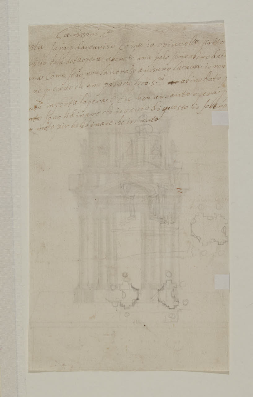 - NOTIZIE STORICO CRITICHE L'Album Tibaldi entra nelle raccolte del Civico Museo d'Arte Antica, al Castello Sforzesco, nel 1905 quando è acquistato grazie al mercante d'arte Julius Böhler di Monaco. Nel 1904 l'avvocato Giuseppe Toesca propone senza successo l'acquisto dell'album al Consiglio Direttivo del Museo. Un anno più tardi, con una grande riduzione di prezzo (da 1800 a 800 lire), la raccolta di 42 disegni entra nelle collezioni civiche su proposta di Gustavo Frizzoni e con il benestare di Luca Beltrami. L'album Tibaldi aveva fatto parte della collezione di Carlo Morbio (1811-1881), nato a Novara ma stabilitosi fin da giovane a Milano. Nel "Catalogo ragionato ed illustrazione degli autografi e dei ritratti di celebri personaggi dal Risorgimento delle lettere insino a noi, raccolti e posseduti dal cav. Carlo Morbio" (Milano, 1857, p. 97) e ancora nelle "Opere Storico-Numismatiche di Carlo Morbio" (Bologna, 1870, p. 186) è lo stesso Morbio a citare la "Cartella di Pellegrino" definita una "preziosa raccolta de' suoi disegni originali" notando come "varj sono firmati col suo monogramma" (1857). È probabile sia stato soprattutto il fraintendimento del monogramma PPAM (inscritto in un cuore sormontato da una croce), all'epoca interpretato come firma di Pellegrino Pellegrini, ad aver portato il conoscitore e chi dopo di lui ebbe modo di vedere e valutare i disegni all'errata attribuzione al Tibaldi; ancora nel 1939, Giovanni Rocco parla in questi termini del marchio dell'album nella sua pubblicazione dedicata all'impegno dell'artista della Valsolda presso il Duomo di Milano. Dopo la morte del Morbio, la figlia Giulia, moglie dell'imprenditore tessile Benigno Crespi, cede gran parte della collezione paterna al libraio Theodor Ackermann che la vende in varie aste a Lipsia. Un altro mercante tedesco, il già citato Böhler, fa da mediatore per il ritorno dei disegni a Milano. \nIl foglio 38 presenta, al recto, il progetto di un tabernacolo formato da una cupola sormontata dal redentore e circondata da coppie di angeli, sorretta da un tamburo dotato di nicchie e statue di santi. La struttura si regge su colonne doriche. La finezza del decoro fa immaginare il progetto fosse da realizzare in bronzo. Al verso del foglio 38 si legge, anche se solo parzialmente, l'appunto per una lettera: s'intuisce che chi scrive, probabilmente l'autore del disegno al recto, si rivolge a dei committenti lamentando una paga molto bassa o comunque ritenuta ingiusta.