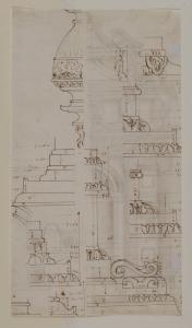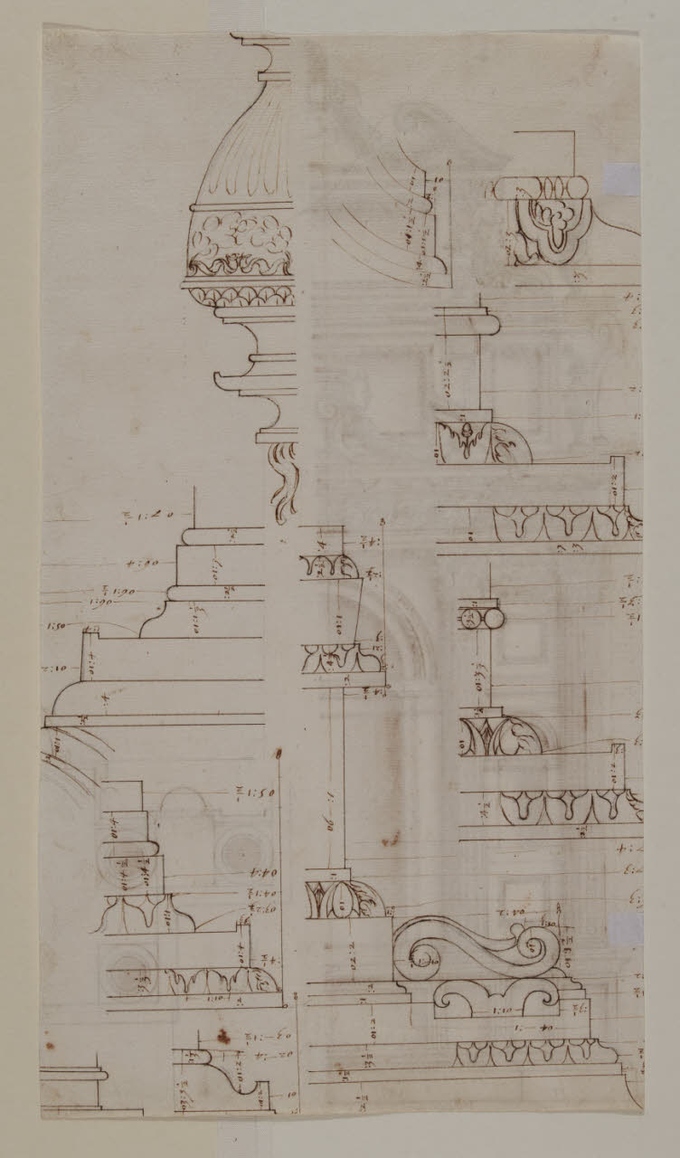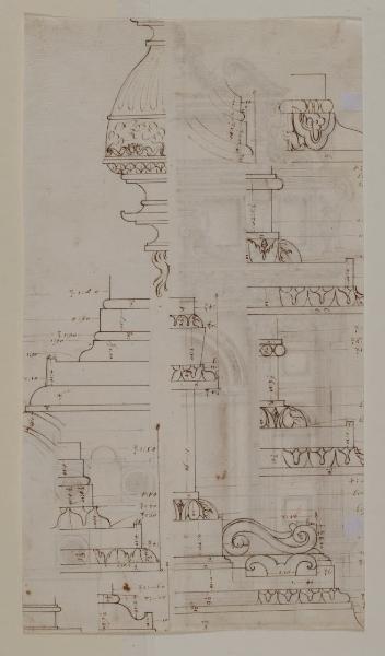 - NOTIZIE STORICO CRITICHE L'Album Tibaldi entra nelle raccolte del Civico Museo d'Arte Antica, al Castello Sforzesco, nel 1905 quando è acquistato grazie al mercante d'arte Julius Böhler di Monaco. Nel 1904 l'avvocato Giuseppe Toesca propone senza successo l'acquisto dell'album al Consiglio Direttivo del Museo. Un anno più tardi, con una grande riduzione di prezzo (da 1800 a 800 lire), la raccolta di 42 disegni entra nelle collezioni civiche su proposta di Gustavo Frizzoni e con il benestare di Luca Beltrami. L'album Tibaldi aveva fatto parte della collezione di Carlo Morbio (1811-1881), nato a Novara ma stabilitosi fin da giovane a Milano. Nel "Catalogo ragionato ed illustrazione degli autografi e dei ritratti di celebri personaggi dal Risorgimento delle lettere insino a noi, raccolti e posseduti dal cav. Carlo Morbio" (Milano, 1857, p. 97) e ancora nelle "Opere Storico-Numismatiche di Carlo Morbio" (Bologna, 1870, p. 186) è lo stesso Morbio a citare la "Cartella di Pellegrino" definita una "preziosa raccolta de' suoi disegni originali" notando come "varj sono firmati col suo monogramma" (1857). È probabile sia stato soprattutto il fraintendimento del monogramma PPAM (inscritto in un cuore sormontato da una croce), all'epoca interpretato come firma di Pellegrino Pellegrini, ad aver portato il conoscitore e chi dopo di lui ebbe modo di vedere e valutare i disegni all'errata attribuzione al Tibaldi; ancora nel 1939, Giovanni Rocco parla in questi termini del marchio dell'album nella sua pubblicazione dedicata all'impegno dell'artista della Valsolda presso il Duomo di Milano. Dopo la morte del Morbio, la figlia Giulia, moglie dell'imprenditore tessile Benigno Crespi, cede gran parte della collezione paterna al libraio Theodor Ackermann che la vende in varie aste a Lipsia. Un altro mercante tedesco, il già citato Böhler, fa da mediatore per il ritorno dei disegni a Milano. \nIl foglio 43 dell'album Tibaldi presenta, al recto, il progetto per un altare. Al verso sono invece annotate le misure e le proporzioni di diversi elementi decorativi.