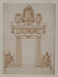 - NOTIZIE STORICO CRITICHE L'Album Tibaldi entra nelle raccolte del Civico Museo d'Arte Antica, al Castello Sforzesco, nel 1905 quando è acquistato grazie al mercante d'arte Julius Böhler di Monaco. Nel 1904 l'avvocato Giuseppe Toesca propone senza successo l'acquisto dell'album al Consiglio Direttivo del Museo. Un anno più tardi, con una grande riduzione di prezzo (da 1800 a 800 lire), la raccolta di 42 disegni entra nelle collezioni civiche su proposta di Gustavo Frizzoni e con il benestare di Luca Beltrami. L'album Tibaldi aveva fatto parte della collezione di Carlo Morbio (1811-1881), nato a Novara ma stabilitosi fin da giovane a Milano. Nel "Catalogo ragionato ed illustrazione degli autografi e dei ritratti di celebri personaggi dal Risorgimento delle lettere insino a noi, raccolti e posseduti dal cav. Carlo Morbio" (Milano, 1857, p. 97) e ancora nelle "Opere Storico-Numismatiche di Carlo Morbio" (Bologna, 1870, p. 186) è lo stesso Morbio a citare la "Cartella di Pellegrino" definita una "preziosa raccolta de' suoi disegni originali" notando come "varj sono firmati col suo monogramma" (1857). È probabile sia stato soprattutto il fraintendimento del monogramma PPAM (inscritto in un cuore sormontato da una croce), all'epoca interpretato come firma di Pellegrino Pellegrini, ad aver portato il conoscitore e chi dopo di lui ebbe modo di vedere e valutare i disegni all'errata attribuzione al Tibaldi; ancora nel 1939, Giovanni Rocco parla in questi termini del marchio dell'album nella sua pubblicazione dedicata all'impegno dell'artista della Valsolda presso il Duomo di Milano. Dopo la morte del Morbio, la figlia Giulia, moglie dell'imprenditore tessile Benigno Crespi, cede gran parte della collezione paterna al libraio Theodor Ackermann che la vende in varie aste a Lipsia. Un altro mercante tedesco, il già citato Böhler, fa da mediatore per il ritorno dei disegni a Milano. \nIl foglio 44 presenta il progetto per un portale, forse apparato effimero, culminante con tre scudi araldici; quello centrale, il più grande, è lo stemma ufficiale di Filippo II d'Asburgo re di Spagna e poi del figlio. Filippo III sposò Margherita d'Austria-Stiria nel 1598 a Ferrara passando poi anche da Milano dove la coppia fu ampiamente celebrata anche perché era intanto morto Filippo II e dunque i coniugi erano ormai regnanti di Spagna.