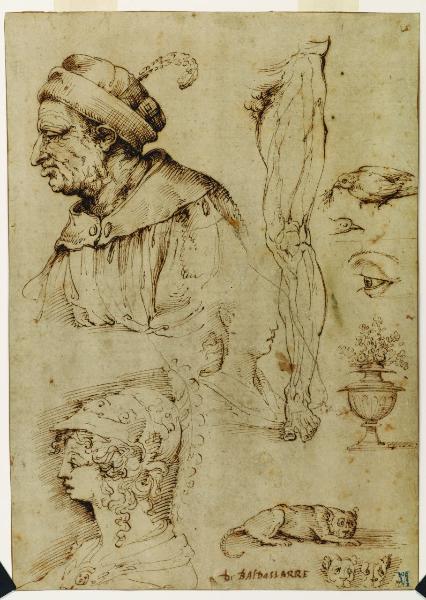 Busto di vecchio con berretto; Studio di volto di giovane; Busto di Minerva; Gamba sinistra; Due studi di colomba; Studio di occhio; Vaso con fiori; Gatto e tre studi di testa dello stesso