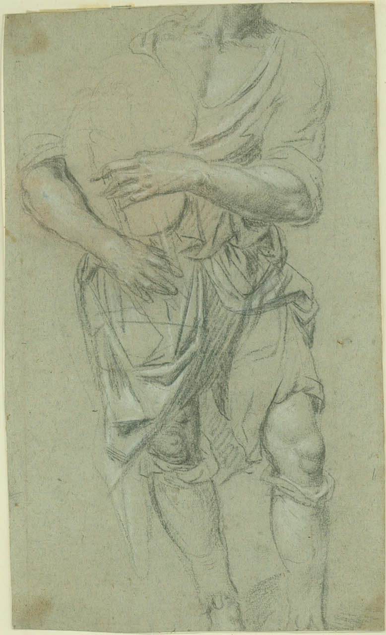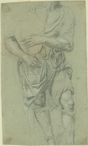 - NOTIZIE STORICO CRITICHE Il foglio presenta forti analogie con la figura di pastore dipinta da Simone Peterzano all'estrema sinistra nella Adorazione dei pastori della Certosa di Garegnano. Si nota una dilatazione formale della figura, che annuncia quella negli affreschi della chiesa di Sant'Angelo. Questo elemento potrebbe significare che il disegno è stato eseguito da un collaboratore attivo a Garegnano oppure, in un momento successivo, da un componente della bottega che ha rieleborato il modello.