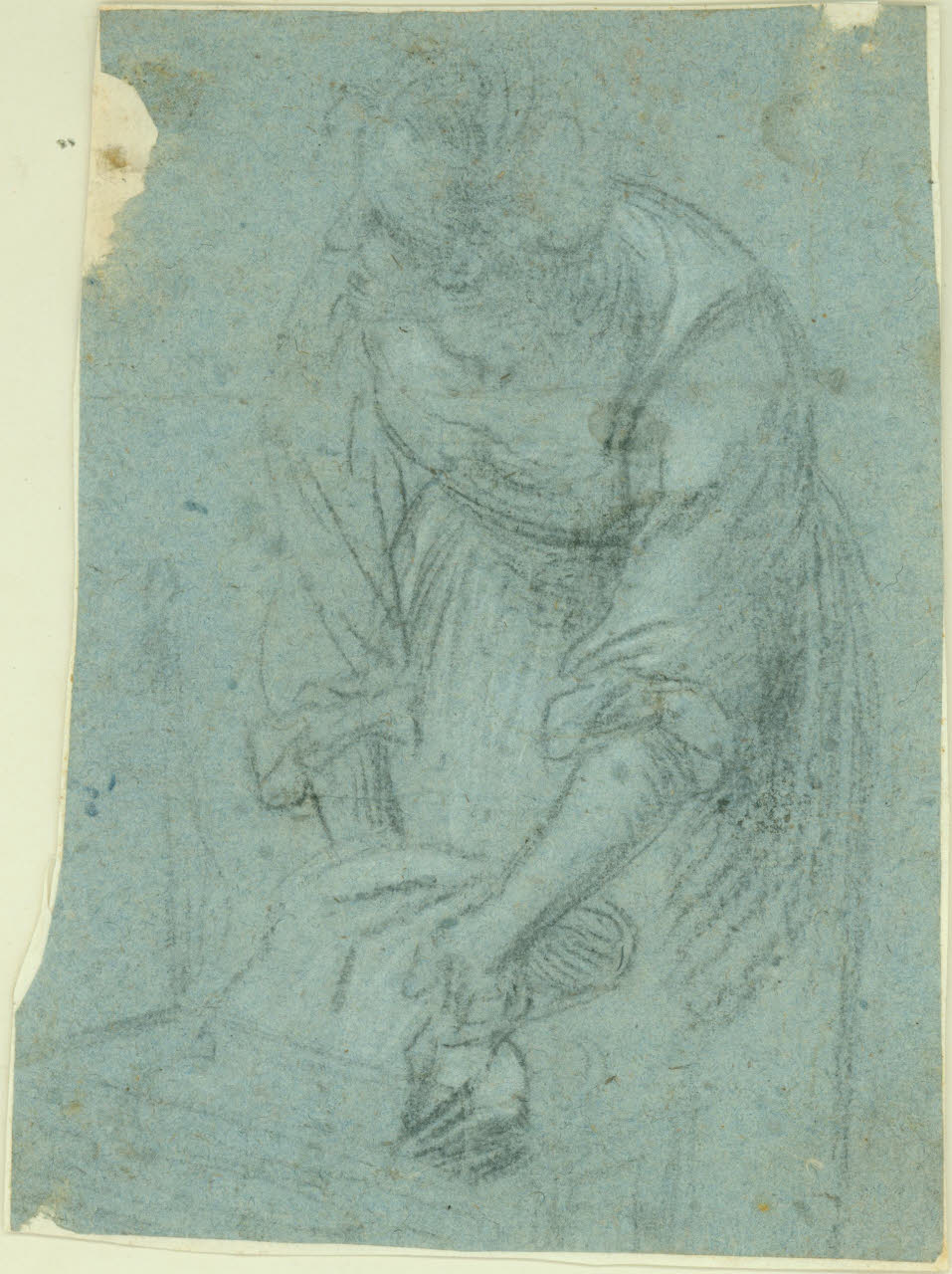 disegno su carta grigio-azzurra eseguito a pietra nera con lumeggiature a gessetto bianco, controfondato