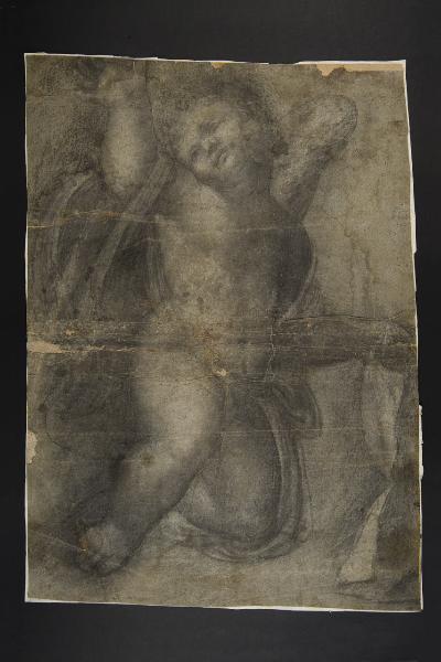 - NOTIZIE STORICO CRITICHE Questo cartone preparatorio rappresenta un raro documento che testimonia la tecnica adottata da Peterzano nel trasporto del disegno in scala reale dalla carta alla superficie pittorica. Ad oggi non si è in grado di rintracciare l'opera per la quale il cartone è stato approntato, ma il modello ricorre spesso nello opere del maestro a partire dai putti affrescati nella controfacciata della chiesa milanese di San Maurizio al Monastero Maggiore. Un simile modello si riscontra anche nella decorazione della cappella di Sant'Antonio nella chiesa di Sant'Angelo a Milano.