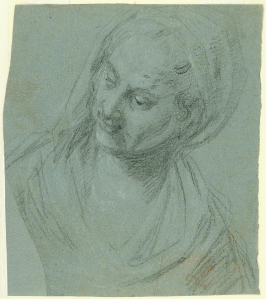 Mezzo busto di donna con il capo coperto, rivolta verso sinistra