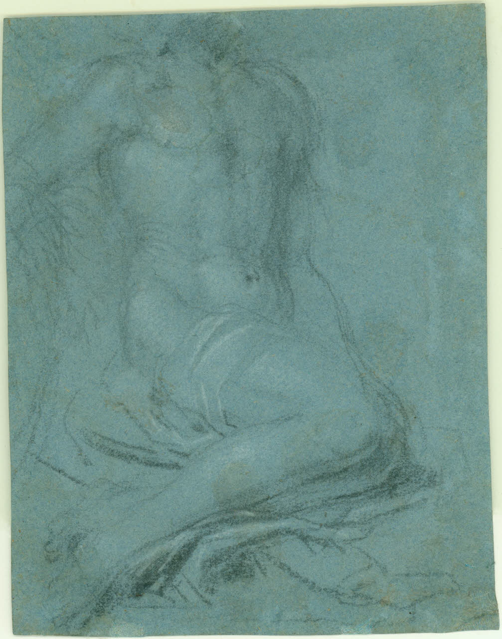 disegno su carta azzurra eseguito a pietra nera naturale con lumeggiature a gessetto bianco