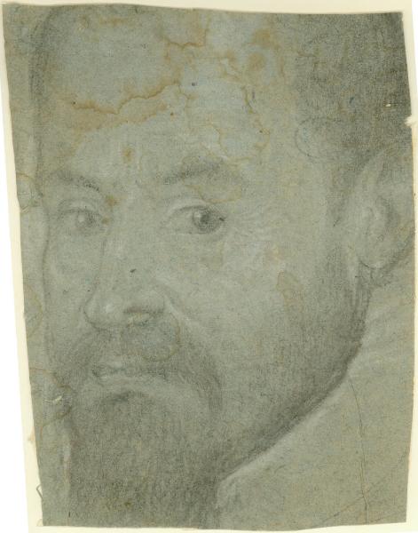 - NOTIZIE STORICO CRITICHE L.P. Gnaccolini ha indicato questo foglio come possibile studio preparatorio per l'Autoritratto, firmato e datato 1589, pubblicato per la prima volta da M. Calvesi (2000), e oggi in collezione privata. Ad una attenta analisi le somiglianze tra il disegno e il quadro paiono vaghe e senza esatte corrispondenze, inoltre lo stile grafico non è quello del maestro.\n\nAttribuito alla bottega di Simone Peterzano nel corso della revisione critica di F. Rossi con la collaborazione di G. Bora e J. Bober (2012/2013) confermato nella revisione di B. Spadaccini (2013).\nAggiornamento della scheda realizzato grazie al contributo della Nando Peretti Foundation-Università degli Studi di Roma Tre, prof. Maria Cristina Terzaghi (2013).