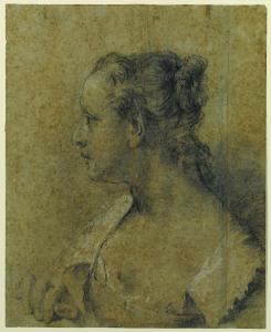 - NOTIZIE STORICO CRITICHE Proveniente dalla Raccolta Trivulzio, questo foglio con una testa di giovane donna a mezzo busto girata verso sinistra venne pubblicato una prima volta da Nicodemi (1945) come autografo di Giovanni Battista Piazzetta. Nel 1971, Precerutti Garberi confermava l'assegnazione del disegno al Piazzetta, che non è stata però recepita dalla critica più recente. La studiosa, pur sottolineando che il profilo della figura è molto ripassato, ne individuava delle somiglianze con la Rebecca al pozzo di Brera. Il foglio subì in passato delle mutilazioni come si evince dal taglio longitudinale sul lato destro e fu risanato da un restauro in antico; nonostante questo, lo stato di conservazione attuale dell'opera permette di apprezzare a pieno la vivezza con la quale è stato reso il modello.