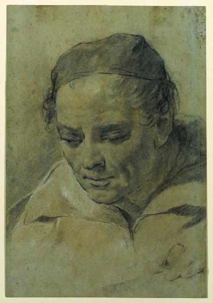 - NOTIZIE STORICO CRITICHE Proveniente dalla Raccolta Trivulzio, questo foglio con una testa d'uomo con berretto e con l'espressione pensosa venne pubblicato una prima volta da Nicodemi (1945) come autografo di Giovanni Battista Piazzetta. Nel 1971, Precerutti Garberi confermava l'assegnazione del disegno al Piazzetta, che non è stata però recepita dalla critica più recente. La studiosa, pur sottolineando i ripassi subiti dal foglio, lo collocava cronologicamente vicino al gruppo di fogli conservati presso l'Accademia di Venezia. La vivezza con la quale è stato reso il modello e la tipologia della "testa di carattere" fanno comunque pensare ad un artista attivo nell'ambito piazzettesco.