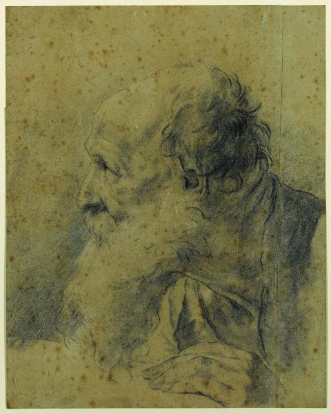 - NOTIZIE STORICO CRITICHE Proveniente dalla Raccolta Trivulzio, questo foglio con una testa di vecchio barbuto di profilo e girato verso sinistra venne pubblicato una prima volta da Nicodemi (1945) come autografo di Giovanni Battista Piazzetta. Nel 1971, Precerutti Garberi confermava l'assegnazione del disegno al Piazzetta, che non è stata però recepita dalla critica più recente. La studiosa, pur riscontrando numerosi ripassi subiti dal foglio, lo accostava idealmente agli Apostoli dipinti da Piazzetta e incisi da Marco Pitteri. Il foglio subì in passato delle mutilazioni come si evince dal taglio longitudinale sul lato destro e fu risanato da un restauro in antico; nonostante questo, lo stato di conservazione attuale dell'opera permette di apprezzare a pieno la vivezza con la quale è stato reso il modello.