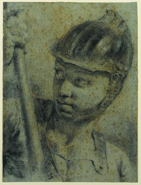 - NOTIZIE STORICO CRITICHE Proveniente dalla Raccolta Trivulzio, questo foglio con una testa di giovane guerriero con elmo e lancia venne pubblicato una prima volta da Nicodemi (1945) come autografo di Giovanni Battista Piazzetta. Nel 1971, Precerutti Garberi confermava l'assegnazione del disegno al Piazzetta, che non è stata però recepita dalla critica più recente. La studiosa ne individuava affinitià tipologica con i disegni per la Gerusalemme liberata del Tasso, pubblicati da Albrizzi in magnifica Edizione nel 1745. Il foglio subì in passato delle mutilazioni come si evince dal taglio longitudinale sul lato destro e fu risanato da un restauro in antico; nonostante questo, lo stato di conservazione attuale dell'opera permette di apprezzare a pieno la vivezza con la quale è stato reso il modello.