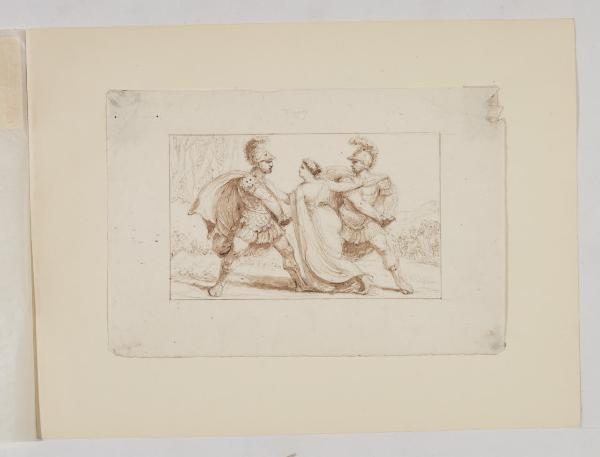 Lotta tra due guerrieri in abiti classici antichi, separati da una giovane donna