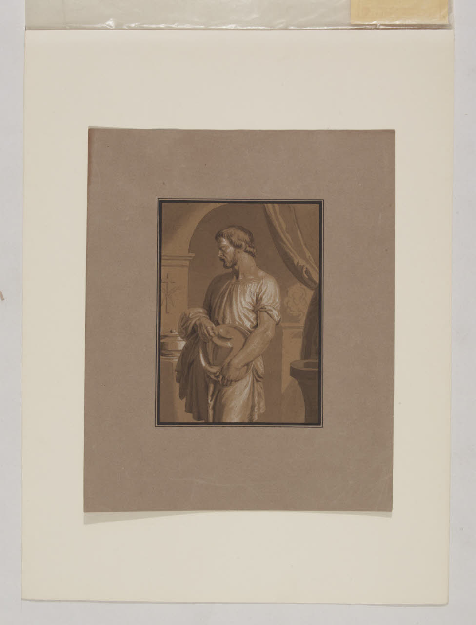 Figura maschile di profilo con brocca e bacile in un interno ecclesiastico