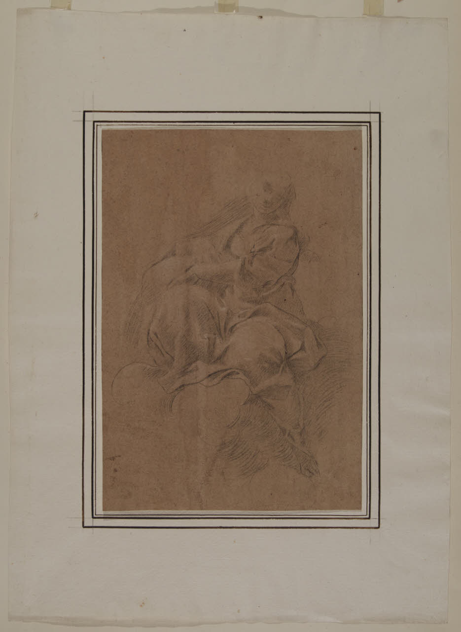 - NOTIZIE STORICO CRITICHE Già appartenuto alla collezione Trivulzio, questo foglio è stato riconosciuto come opera di Giovanni Battista Pittoni. Non incluso nello studio di Binion (1983) sull'opera grafica dell'artista, questo Studio per una Madonna con il Bambino è identificato da Perissa Torrini (1998) come preparatorio per la pala raffigurante la Madonna con il Bambino e san Filippo Neri nella chiesa di San Giovanni elemosinaro di Venezia compiuta entro il 1715. Altri disegni preparatori per quest'opera giovanile del Pittoni sono stati individuati dalla studiosa (Perissa Torrini 1998, p. 27). Come per molte altre prove grafiche di quest'artista, lo studio in esame è condotto a matita e rialzi a gessetto bianco su carta colorata, dimostrando in questa scelta di materiali e tecniche una certa aderenza alla coeva arte francese.