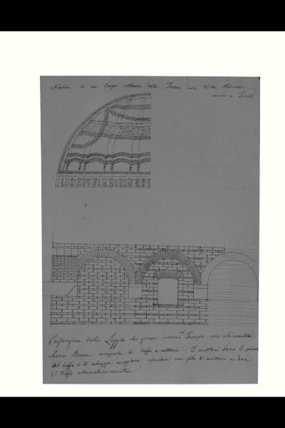 - NOTIZIE STORICO CRITICHE Mentre la parte superiore del foglio è inerente alla decorazione di una nicchia di Villa Adriana, la parte inferiore raffigura, con indicazioni grafiche, le murature in tufo e mattoni delle strutture a loggia attorno alla cosiddetta "Rocca Bruna"