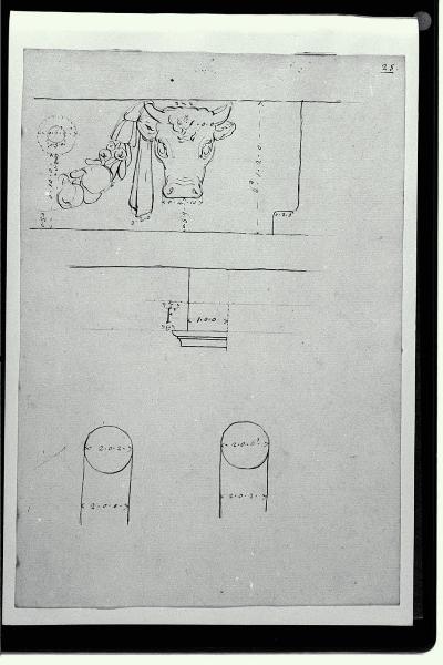 - NOTIZIE STORICO CRITICHE Relativamente al Tempio di Vesta in Tivoli, oltre a questo disegno Pollack ne ha eseguiti almeno altri sette, tutti minuziosamente quotati e relativi all'ordine architettonico e alle cornici di porte e finestre (Inv. A 1773, A 1754 r. e v., A 1767 v., A 1759 r. e v., A 1760 v.)