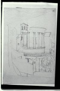 • NOTIZIE STORICO CRITICHE Relativamente al Tempio di Vesta in Tivoli, oltre a questo disegno Pollack ne ha eseguiti almeno altri sette, minuziosamente quotati e relativi all'ordine architettonico e alle cornici di porte e finestre (Inv. A 1754 r. e v., A 1767 r. e v., A 1759 r. e v., A 1760 v.)