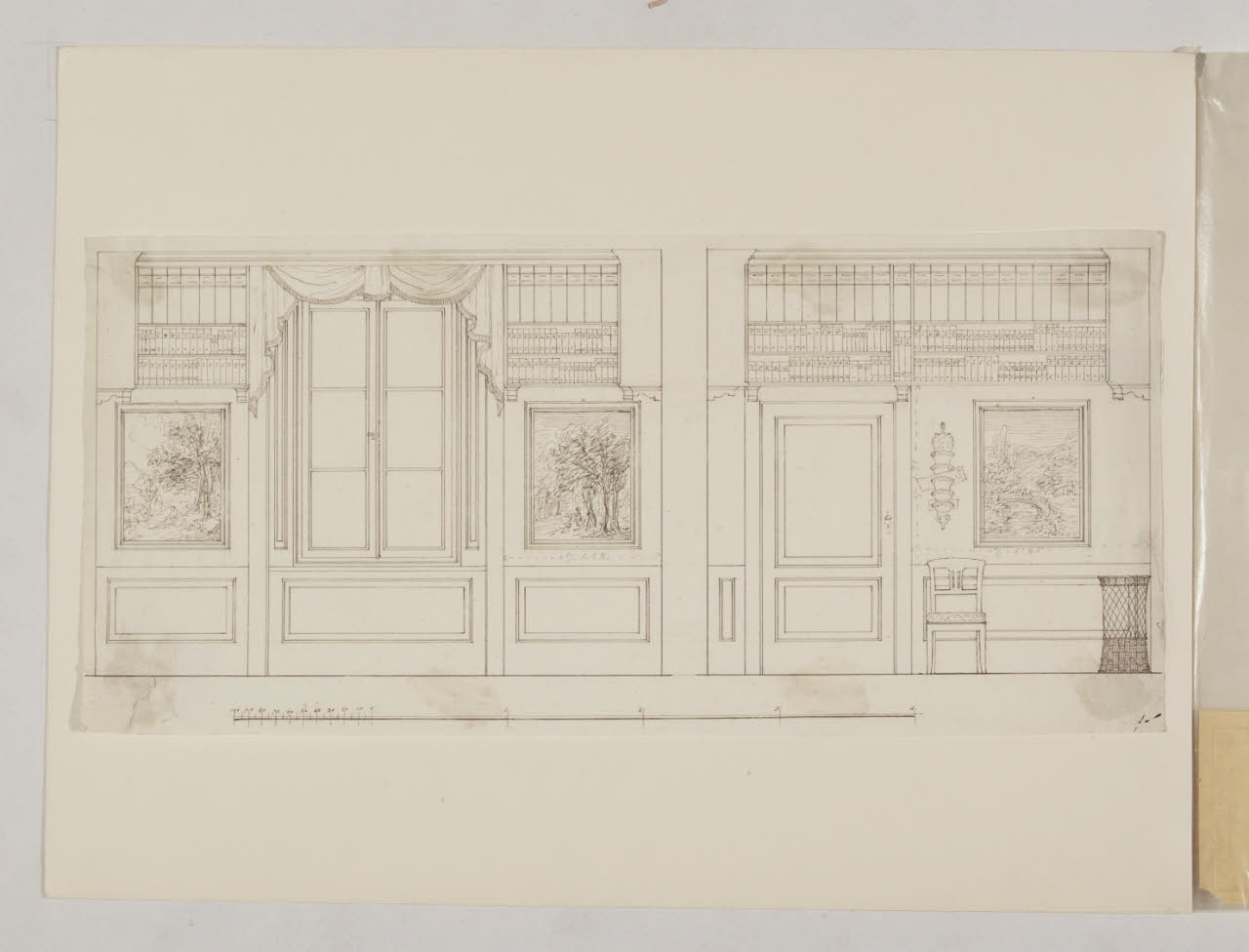- NOTIZIE STORICO CRITICHE Come sottolinea Dallaj (2009), all'interno del nucleo di fogli del Civico Gabinetto dei Disegni inizialmente schedati come Pollack ve ne sono almeno sei eseguiti da Giuseppe Macinata, il quale conobbe Gaffuri nel 1873. Oltre al disegno in questione si citano anche gli Invv. A 1736, A 1742, A 1745, B 1872, B 1873. Alcuni di essi recano sul verso la scritta "Macinata", eseguita da Gaffuri. Per l'attribuzione a Macinata si possono chiamare a confronto altre prove del pittore contenute nel taccuino B 4 del Gabinetto dei Disegni. La pubblicazione iniziale sotto il nome di Pollack è stata probabilmente influenzata dall'assonanza di questi fogli con alcune composizioni di decorazione per soffitto e stanze eseguite dall'architetto.\nAssieme all'Inv. Au. B 1872, anch'esso progetto per gli arredi di un archivio, questo foglio presenta una chiarezza di impaginazione forse derivabile dall'impatto che i disegni di Pollack, di mezzo secolo precedenti, ancora avevano sugli artisti e architetti dell'Ottocento.