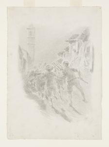 Allarme notturno - "Ton, ton, ton! (...) i più curiosi e più bravi scendono a prender le forche e gli schioppi, per correre al rumore". Illustrazione per i Promessi Sposi - Capitolo VIII