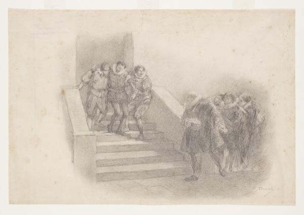 Ferrer trae in salvo Ludovico Melzi d'Eril, il vicario - "Il vicario scendeva le scale, mezzo strascicato e mezzo portato". Illustrazione per i Promessi Sposi - Capitolo XIII