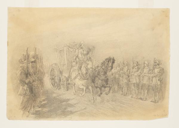 La carrozza di Ferrer fra i soldati - "(...) E sferzando i cavalli, fece loro prender la rincorsa verso il castello". Illustrazione per i Promessi Sposi - Capitolo XIII, finale di capitolo