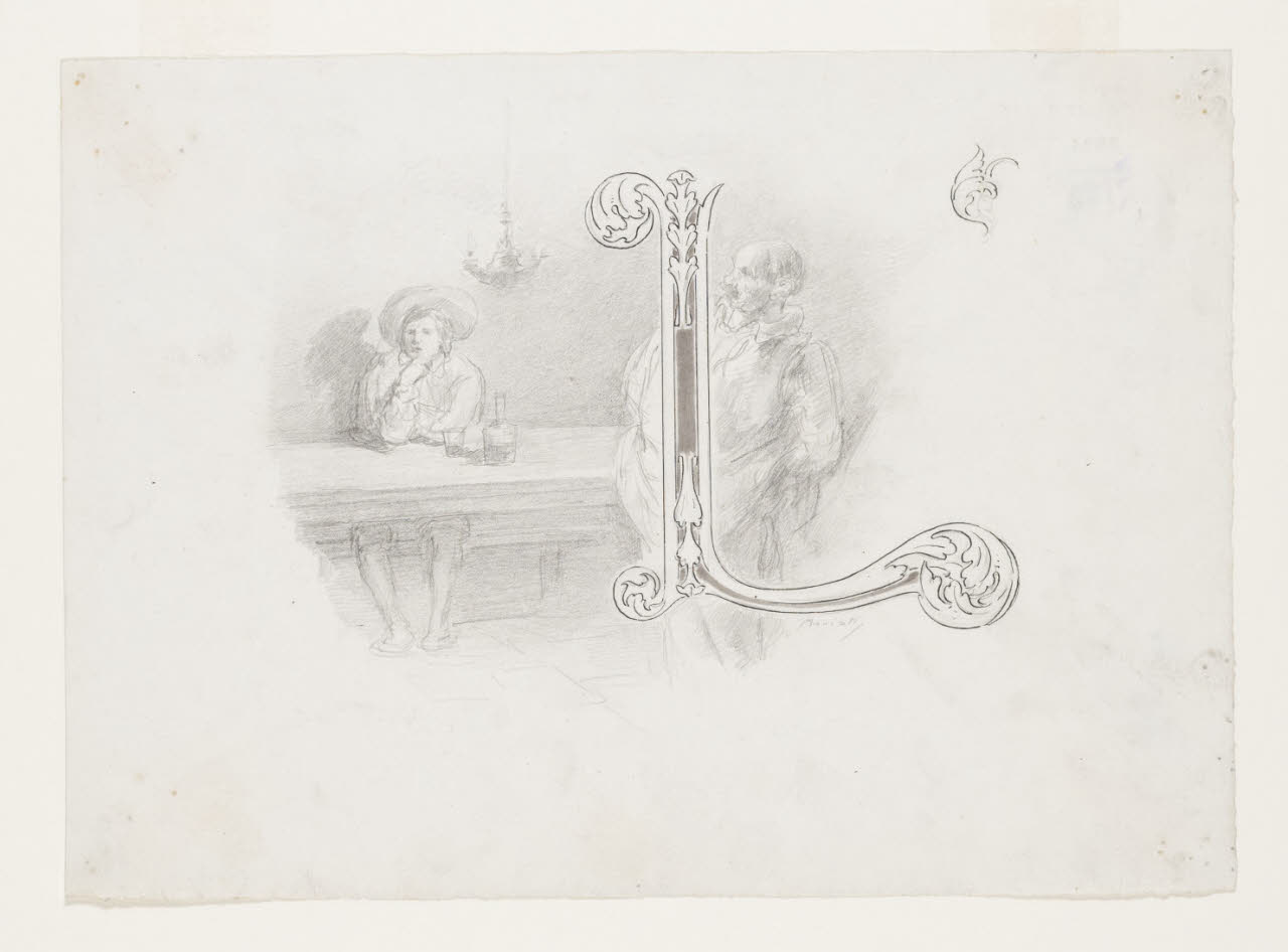 Lettera L - "L'oste, vedendo che il gioco andava in lungo, s’era accostato a Renzo". Illustrazione per i Promessi Sposi - Capitolo XV, iniziale