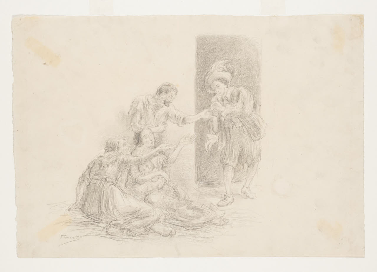Renzo soccorre i poveri bergamaschi - "La c'è la Provvidenza! - disse Renzo". Illustrazione per i Promessi Sposi - Capitolo XVII