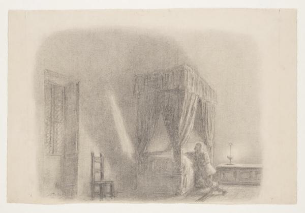 L'innominato che prega - "Trovò in un cantuccio riposto e profondo della mente, le preghiere ch’era stato ammaestrato a recitar da bambino; cominciò a recitarle". Illustrazione per i Promessi Sposi - Capitolo XXIV, finale di capitolo