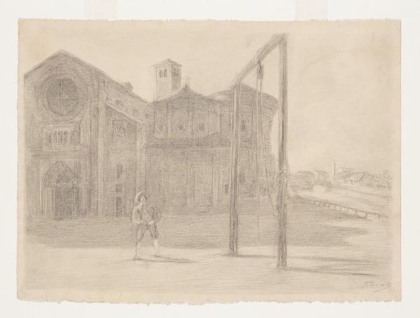 Renzo guarda la forca eretta in piazza San Marco - "Era uno di que' rimedi eccessivi e inefficaci de' quali (...) si faceva tanto scialacquìo". Illustrazione per i Promessi Sposi - Capitolo XXXIV