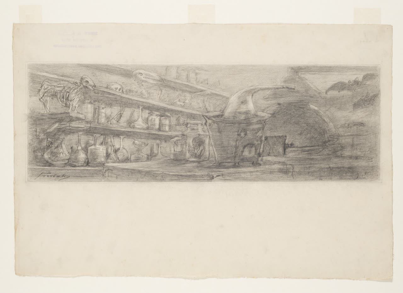 Interno di un laboratorio di alchimia. Illustrazione per la Storia della colonna infame - Capitolo IV, intestazione