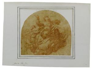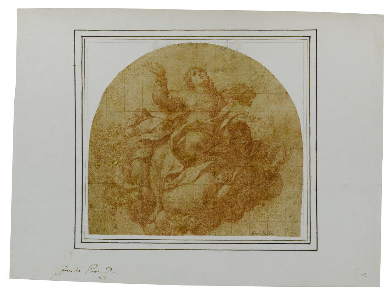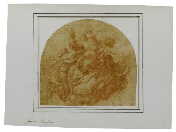- NOTIZIE STORICO CRITICHE Il disegno è stato recentemente messo in relazione con la parte superiore di un' "Assunzione della Vergine" dipinta da Camillo Procaccini, ora conservata nella chiesa di San Matteo a Pontedera, frazione La Rotta (Renzi 2018).\nIn precedenza il foglio era stato ritenuto uno studio preparatorio, con numerose varianti, per l'affresco con "Assunzione della Vergine" realizzato da Camillo Procaccini sulla volta dell'abside della chiesa di Sant'Angelo a Milano. Un altro disegno preparatorio per la medesima opera è conservato presso la Biblioteca Ambrosiana (inv. Cod. F 254 INF n. 1356). Secondo Neilson (1968), nel foglio oggi al Castello Sforzesco Procaccini si è ispirato alla "Vergine" dipinta da Correggio nella cupola del Duomo di Parma.\nIl disegno mostra, in basso a sinistra sul montaggio di collezione, l'iscrizione a penna di Giuseppe Bossi "Camillo Proc."; in basso a destra sul disegno la scritta antica "Camillo Proc.", ricorrente anche in altri fogli di Camillo.