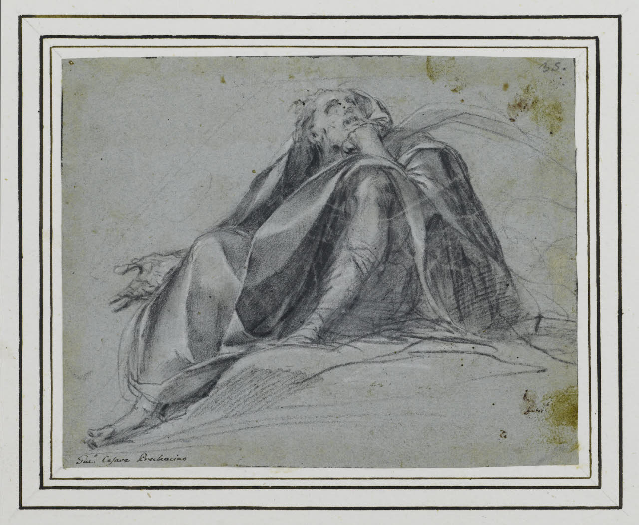 - NOTIZIE STORICO CRITICHE Inizialmente ritenuto da Neilson (1969) uno studio per una figura di profeta nella volta della cappella della Pietà in Santa Maria presso San Celso a Milano, successivamente come un'idea procaccinesca per il soffitto della cappella dei Santi Nazaro e Celso (Neilson 1974), è oggi correttamente interpretato come disegno preparatorio di Giulio Cesare Procaccini per la cappella della Pietà. Un altro studio di "Profeta seduto" per la stessa figura, a matita nera su carta azzurra con quadrettatura a matita nera, è conservato presso il British Museum (inv. 1979,1006.86). Il foglio presenta, in basso a sinistra, la scritta antica a penna "Giu.o Cesare Prochaccino".