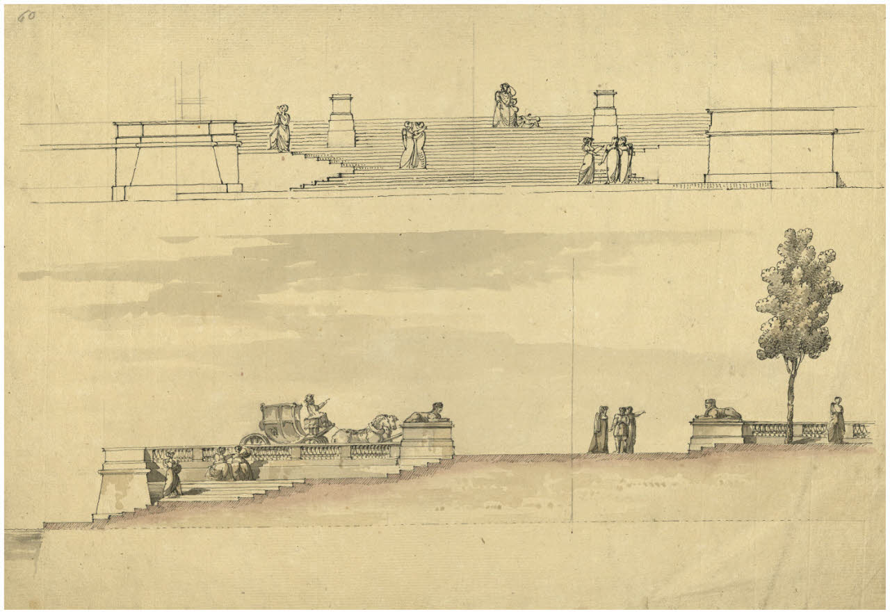 Progetto per la scalea discendente alla Neva tra il Palazzo d'Inverno e l'Ammiragliato a Pietroburgo. Prospetto. Sezione con viale retrostante. Progetto per la scalea discendente alla Neva tra il Palazzo d'Inverno e l'Ammiragliato a Pietroburgo. Prospetto. Sezione con viale retrostante