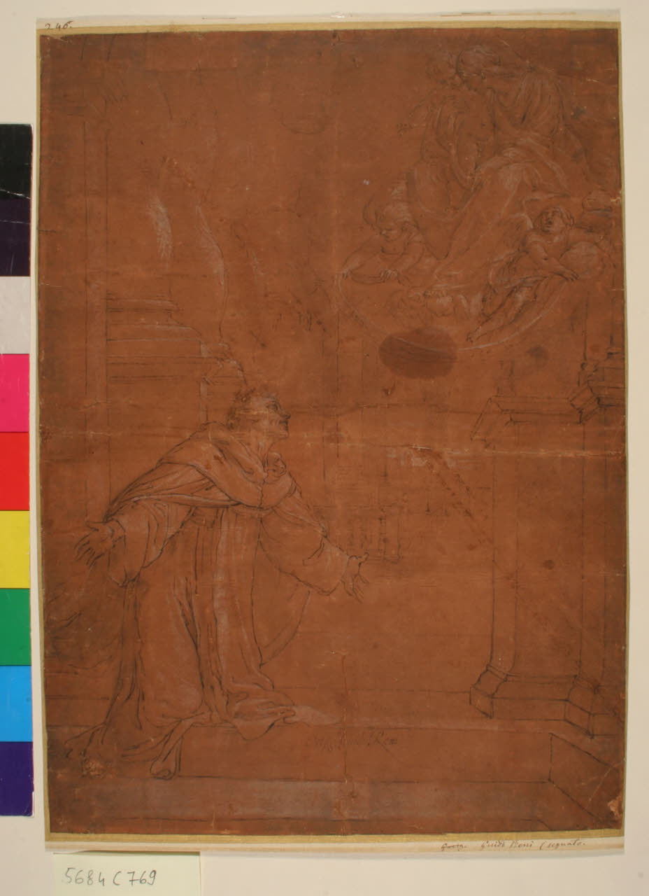 - NOTIZIE STORICO CRITICHE Per questo disegno Reni ha tratto ispirazione da un soggetto di Ludovico Carracci. Pepper riteneva che il foglio del Castello fosse l’unica testimonianza visiva superstite del dipinto di analogo soggetto ancora presente nel 1863 nella cappella Garisendi della chiesa di San Mattia a Bologna, che egli collocò nel 1598-1599. Tuttavia, secondo Catherine Loisel (2022) la datazione del disegno milanese deve essere certamente anticipata in considerazione dello stile, ancora così vicino a quello di Ludovico.