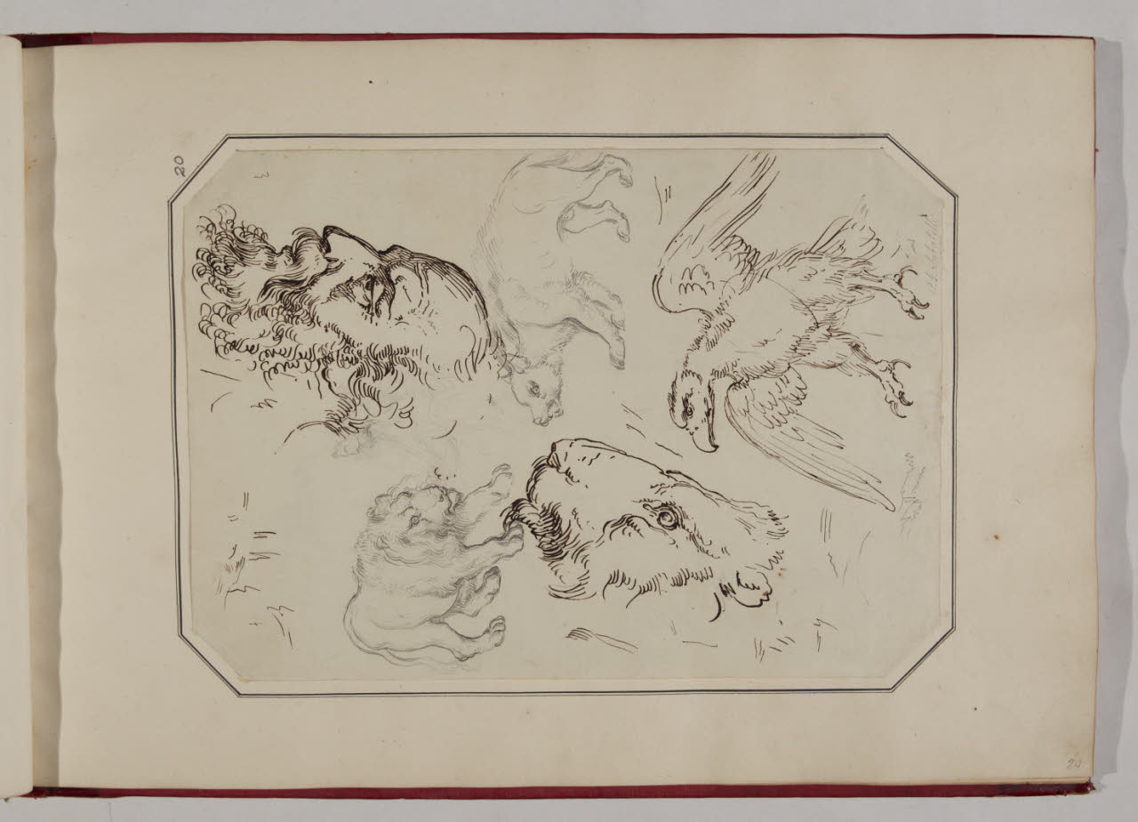 Studi di una testa maschile, un'aquila, un'orsa, un leone e una testa di leone