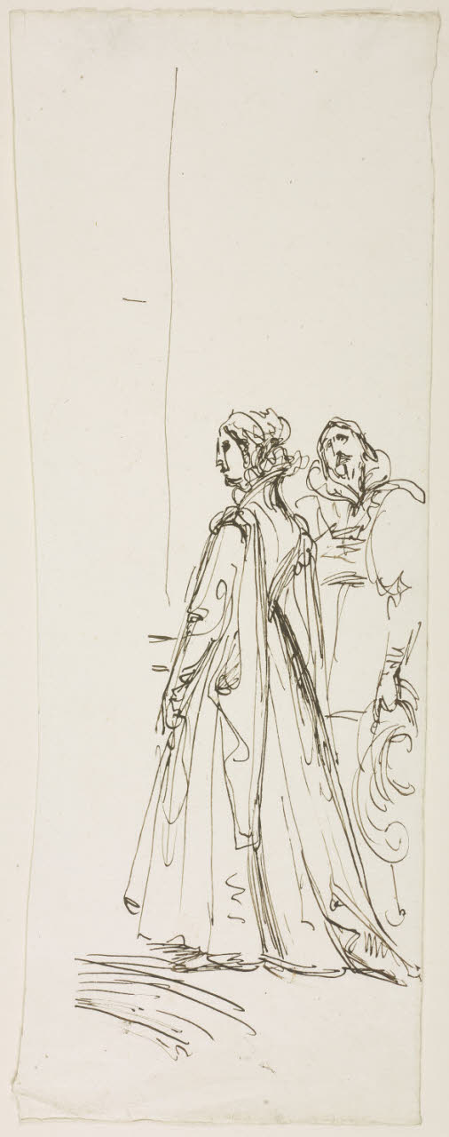 - NOTIZIE STORICO CRITICHE L'episodio non compare nell'elenco delle opere eseguite dall'artista, ma la tematica tipicamente lombarda fa supporre che il disegno fu eseguito da Luigi Sabatelli durante il suo soggiorno milanese. Difatti, il foglio può essere confrontato con il disegno a penna e inchiostro eseguito da Luigi Sabatelli entro il primo quarto del XIX secolo e raffigurante il "Battesimo di san Carlo", conservato presso il Museo Valtellinese di Storia e Arte di Sondrio (n. inv. N.I.L.656, recto). Nel foglio citato è evidente la suggestione delle atmosfere milanesi evocate dalle poesie del Porta, di cui si leggono proprio alcuni versi dell'"Epitaffi per on can d'ona Marchesa". Il disegno del Castello Sforzesco rappresenterebbe uno studio preliminare per i due soggetti - rispettivamente una dama di profilo ed un gentiluomo col cappello nella mano sinistra - sulla destra del foglio valtellinese.