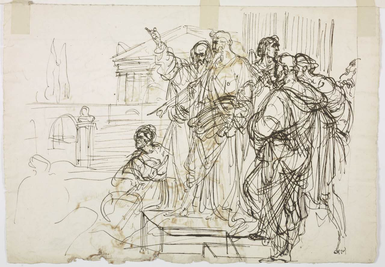 Composizione di soggetto classico con figure davanti ad un tempio