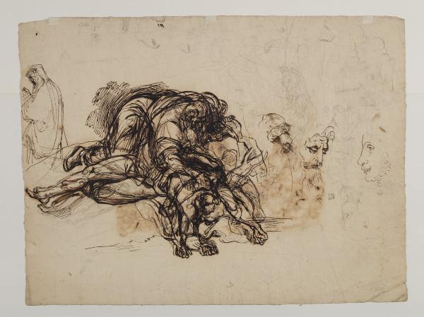 Zuffa tra uomini, figura incappucciata, cavallo e schizzi di teste maschili di profilo