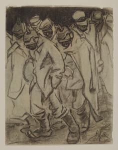 - NOTIZIE STORICO CRITICHE Tornato in Italia da Parigi dopo lo scoppio della Prima Guerra Mondiale, l’artista continuò con fervore il suo lavoro di illustratore. In questo periodo si dedicò quasi totalmente alla tragica caricatura di guerra, contribuendo alla propaganda antiaustriaca all’interno di diversi giornali come «Numero», «420» e illustrando i due albi "Gli unni e gli Altri". Le immagini riprodotte al loro interno, meglio di qualsiasi altro mezzo propagandistico, avevano l’obiettivo di rivelare lo spirito dell’Italia in guerra e demonizzare così le potenze nemiche. Da collocare tra il 1916 e il 1918, sono pertanto due fogli, oggi conservati all’interno del Civico Gabinetto di Disegni del Castello Sforzesco, denominati "Prigionieri tedeschi" (inv. 6257/1 D 474 Recto) e "Prigionieri austriaci" (inv. 6261 E 121); questi risultano acquistati rispettivamente dalla Galleria Pesaro nel 1920 e dalla Galleria Dedalo nel 1933. Dalla Galleria Dedalo, nel settembre del 1933, si registra l’acquisto di tre fogli di Enrico Sacchetti: "Prigionieri austriaci" (inv. 6261 E 121), "Autoritratto" (inv. 6259 D 476) e "Ritratto di Giovanni Papini" (inv. 6260 D 477); quest’ultimo è illustrato all’interno del catalogo dell’ "Esposizione di Enrico Sacchetti, G. Cesare Vinzio, Emilio Vitali", avvenuta all’interno della Galleria Pesaro nel marzo del 1933.\nNei disegni con i prigionieri, così come in molti altri dello stesso soggetto, si osserva che la deformazione caricaturale dei gesti e dei volti dei soldati "non dipende da odio di nemico, o da facile gusto di grottesco", ma corrisponde, invece, al tipico processo di sintetizzazione dell’immagine che "dice intorno a quella gente molto più di quanto potrebbero dire volumi interi di antropologia, di etnografia e di storia" (G. Fanciulli, Enrico Sacchetti, in "Emporium", v. XLIX, 1919, p. 25). Nelle due opere tutto l’orrore della guerra è affidato ai gesti e ai tratti somatici dei volti degli effiggiati che si avvicinano, per molti aspetti, alle teste dei combattenti tedeschi apparsi nella serie di cartoline caricaturali realizzati dall’artista nel 1917, successivamente rielaborate e integrate per l’album "Loro" del 1919 (cfr. E. Sacchetti, Loro, con una presentazione di U. Ojetti, 1919). Come in quest’ultime opere, anche nei fogli del Castello, il segno di Sacchetti esalta crudelmente la fisicità dei soldati, evidenziando "gli ambigui menti sfuggenti e gli occhi dal minaccioso taglio orientale, in un campionario umano, in cui ogni ‘ritratto’, narra una storia di ottusa e bestiale alterità, nella quale anche i copricapi, elmi e berretti militari in forma di mostruose escrescenze organiche, diventano altrettanti elementi fisiognomici" (A. Pallottino, Il gigante Sacchetti, in Enrico Sacchetti. Il volto del Novecento. Caricature, ritratti, illustrazioni, a cura di C. Bibolotti, F.A. Calotti, Siena 2003, p. 14).