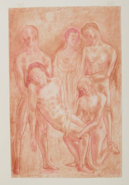 - NOTIZIE STORICO CRITICHE Il dramma della morte di Cristo è uno dei temi che più appassionarono il pittore milanese tra il 1932 e il 1933 e sul quale ritornò qualche decennio dopo. Alla fine degli anni Cinquanta, all'interno del catalogo della personale tenuta alla Galleria San Fedele, è lo stesso Sassu a descrivere i motivi che lo avevano condotto a interessarsi alla rappresentazione del sacro, e in modo specifico al ciclo della Passione. Egli scrive: "il tema della morte di Cristo è ricorrente nel mio lavoro, con un'insistenza ossessiva. È questo un tema attorno al quale la mia fantasia lavorava, quasi un configurarsi della urgente tragica condizione dell'uomo, dell'uomo della mostra epoca... quel ponte che dalla nascita dell'uomo ci conduce passo passo alla morte è come una vena viva di sangue che si rivela in tutti i suoi elementi di sacro, di tragico, di grottesco, ma sempre lo specchio della nostra umanità, della nostra ansia del vero, dell'essere uomini veri... queste premesse di ordine estetico non sono staccate dal grave e profondo contenuto di questo problema veramente universale che è la via Crucis". \nDopo aver esposto, nel 1932, una "Deposizione" alla Galleria del Milione, Sassu torna con insistenza sul tema. Di questo soggetto infatti il Gabinetto di Disegni del Castello Sforzesco conserva due opere su carta: una "Deposizione" realizzata a sanguigna (sul cui verso è presente uno studio della stessa in controparte, eseguita attraverso un semplice tratto di sanguigna, invv. 6346 E 125 Recto e Verso) e un "Cristo deposto" eseguito ad acquerello (inv. 6347 C 850). Entrambe le opere furono acquistate direttamente presso l'artista rispettivamente nel 1933 e nel 1934. Pur differenziandosi per tecnica esecutiva, sono accomunate da quella forte tensione emotiva "affidata alla suggestione del rapporto linea-colore in scoperta antitesi con i canoni del novecentismo" (Dallaj 1991). \nLa "Deposizione" ripropone modi arcaizzanti legati alla tradizione dell'arte italiana ed è presentata con un tratto tenue e sfumato della sanguigna. Quest'ultima descrive le ombre dei cinque corpi nudi sottolineando maggiormente il perimetro che le descrive. A esso l'artista sovrappone il tratto di matita rossa che ne accentua la volumetria. Viceversa, nel "Cristo deposto", Sassu adotta un linearismo decorativo di ascendenza matissiana-espressionista, componendo le figure attraverso le sole linee di contorno. Fluidi tratti di acquerello color arancio delimitano le figure della scena, mentre tutto intorno veloci pennellate acquose cospargono lo spazio circostante con un azzurro tenue, un acceso giallo limone e tocchi di verdastro. Questi ultimi contribuiscono ad accentuare quell'esperienza emozionale del colore che l'artista cercava.